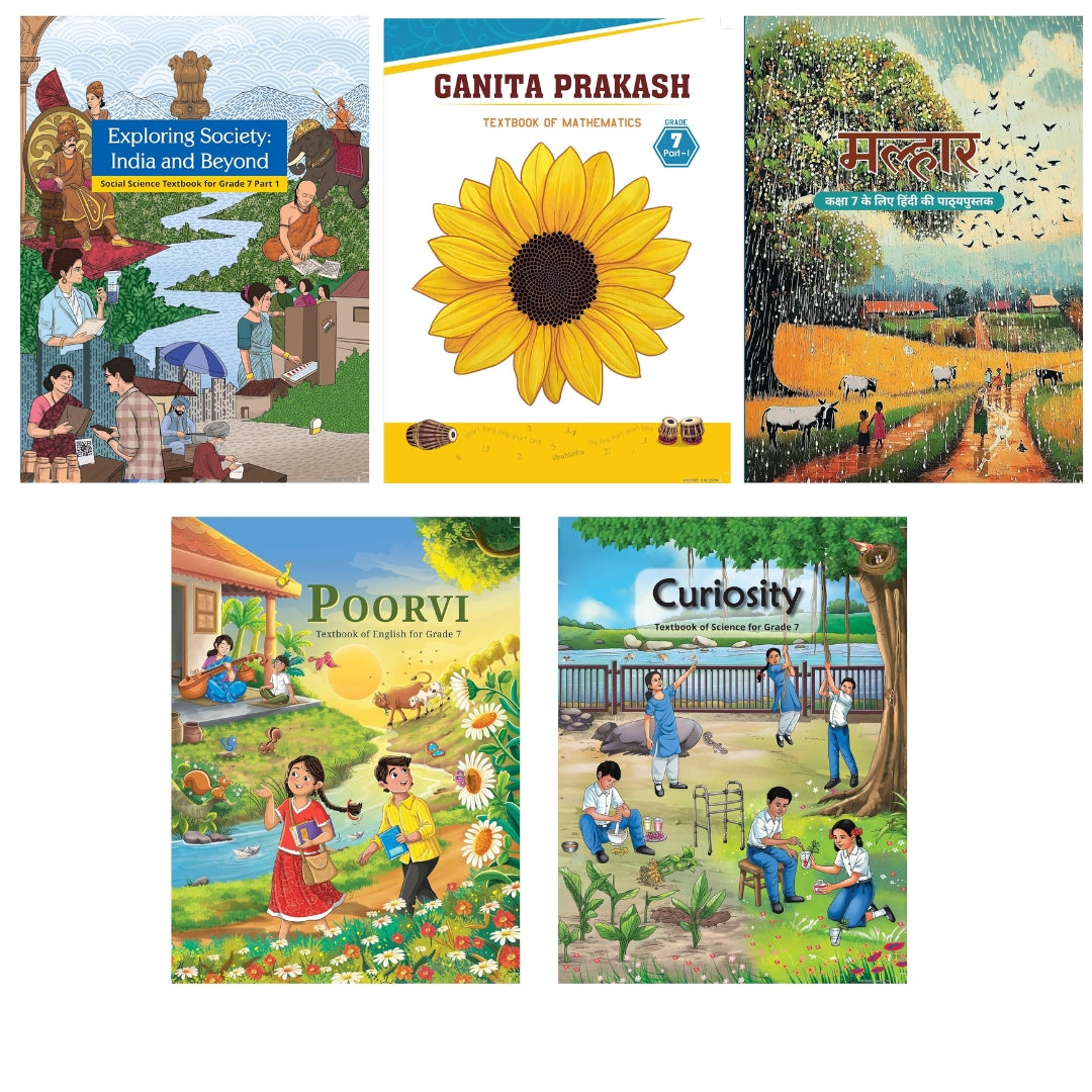 NCERT Ganita Prakash (Mathematics), Curiosity (Science), Exploring Society (Social), Malhar (Hindi) & Poorvi (English) Textbook for Class 7 - Set of 5 Books - Latest Edition